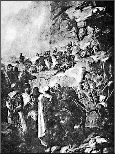 De quel côté maintenant chercher la fortune ! On ouvre au hasard un livre magique, et il indique le levant. On fait tourner une aiguille en murmurant des formules magiques, et elle marque aussi l'orient. Les corsaires prennent cette direction, et consultent les présages. Un d'eux tient une flèche de chaque main et rapproche leurs pointes l'une de l'autre, sans d'ailleurs gêner le mouvement. Puis le khodja, ou secrétaire du bâtiment, lit des formules magiques et dessine des caractères cabalistiques ; les flèches aussitôt se rapprochent d'elles-mêmes et s'entrechoquent. L'une d'elles, celle qui signifie les chrétiens, tombe de la main du pirate, et l'autre, qui marque les musulmans, se soutient en signe de victoire. On marche donc avec confiance ; et pour que Mahomet soit encore plus favorable, le khodja fait rougir au feu un grand clou, et le passe en forme de croix, sans pourtant les brûler, sous les pieds des Turcs et des chrétiens.